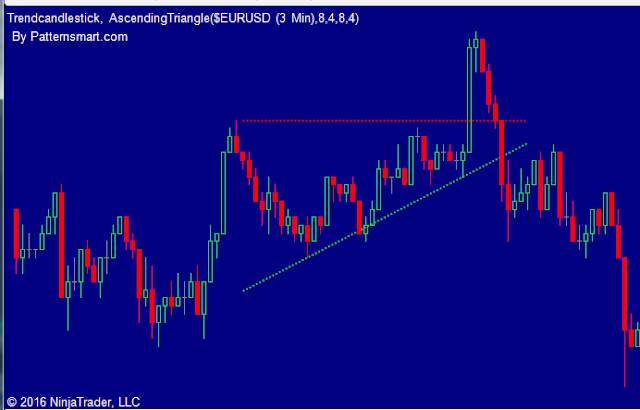 Furthermore, the price difference between the the 2 Lows(troughs) which form the lower trend line may vary. In a short term(could be small time frame or formation with fewer bars) Ascending Triangle pattern, the price difference could be much smaller than it in a long term one.