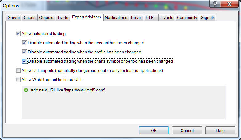 First of all, before using of experts, one has to set them up first. Working parameters common for all experts are defined in the client terminal settings window. This window can be opened by the “Tools — Options” menu command or by pressing of accelerating keys of Ctrl+O.