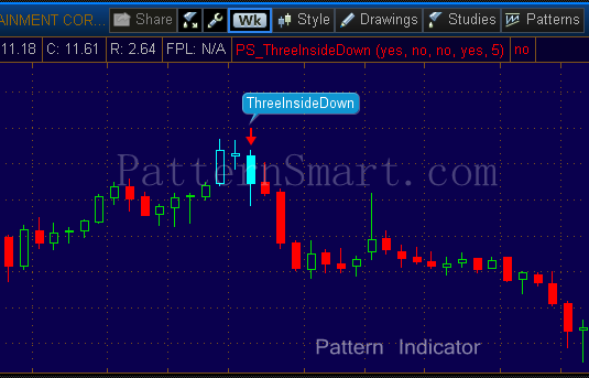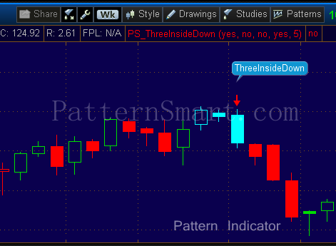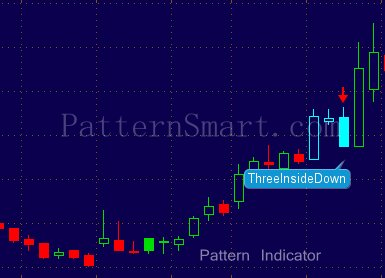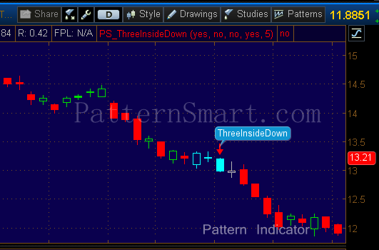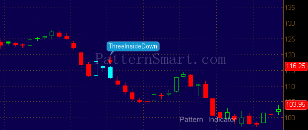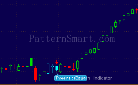 Three Inside Down is a bearish candlestick pattern made up of 3 candles.