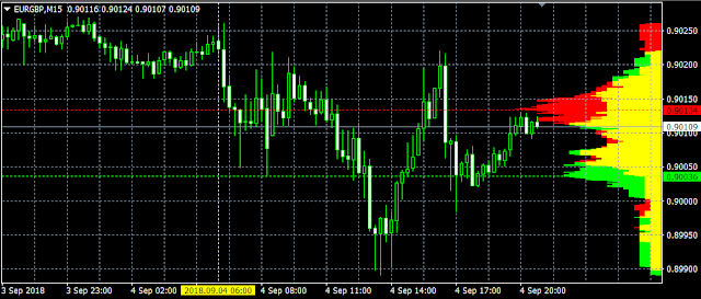 In the chart below, Down/negative volume is set to red color and UP/positive volume is green color. When there is more Down/negative volume than UP/positive volume at the same level, the positive volume color will be shown as yellow bar, and vice versa.