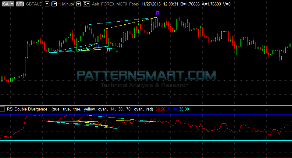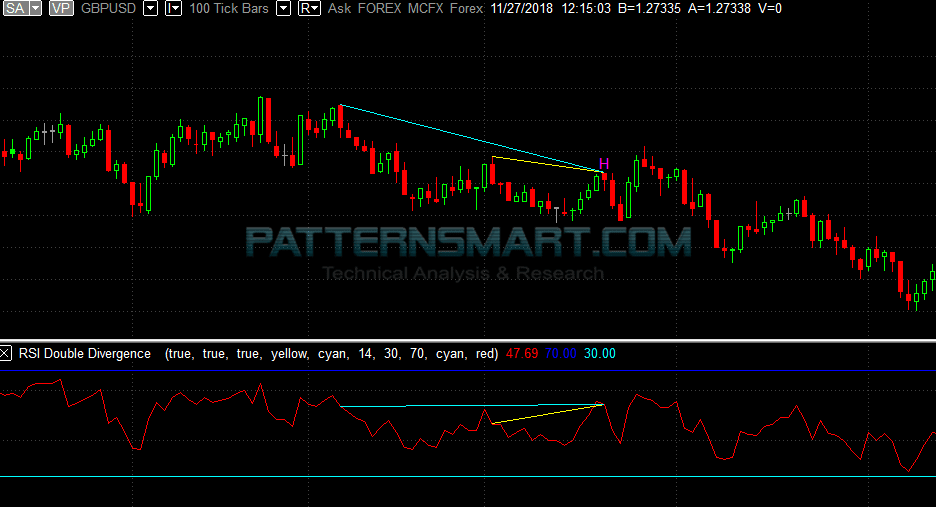The following chart shows the regular bullish RSI Double divergence and hidden bearish RSI Double divergence.
