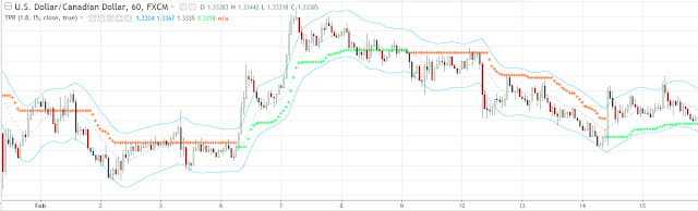 The TPR band gives a possible range of the TPR movement, if TPR is outside the band for many bars or far away from the band, it could be a sign of trend reversal. The orange and cyan dots give possible reversal signals.
