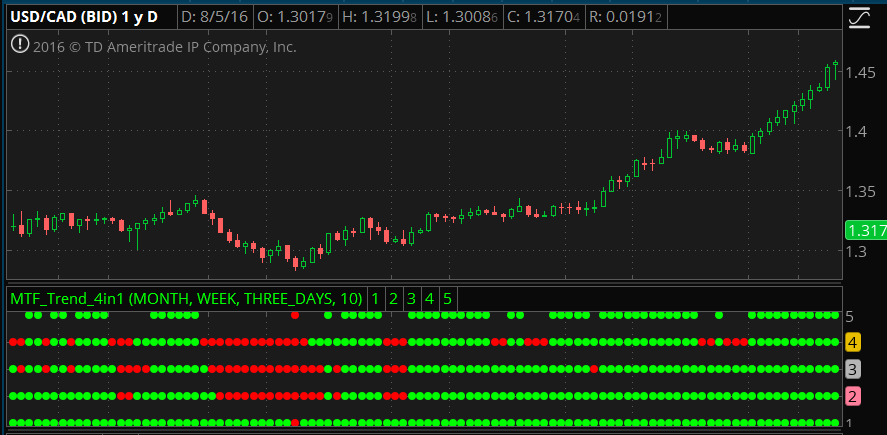 If current and 3 higher time frames are in the same direction, the dots at the top will appear.