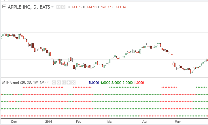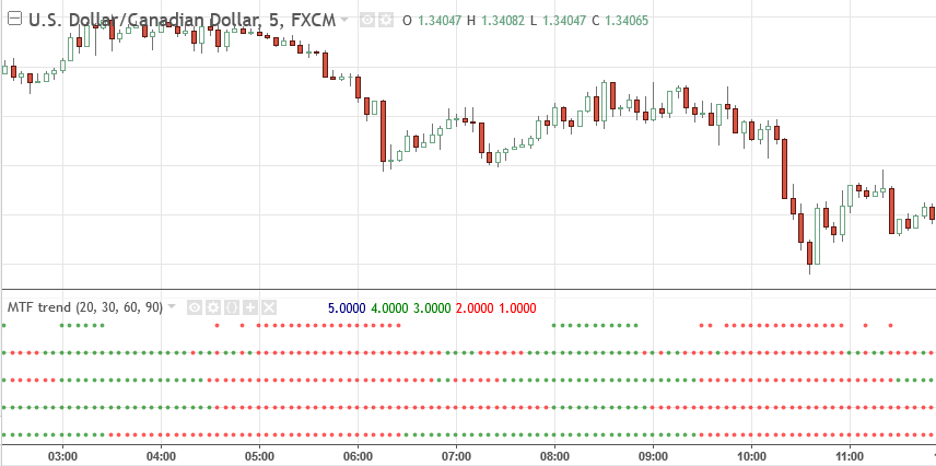 If current and 3 higher time frames are in the same direction, the dots at the top will appear. Otherwise, there will be no dots at value 5.