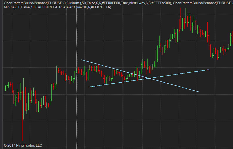 Pennant: Uses two converging trendlines to form a small triangle. The consolidation is more symmetric.
