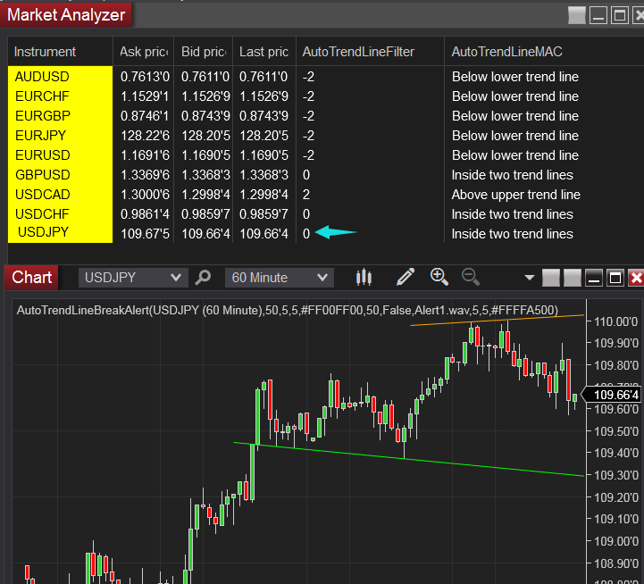 The Market Analyzer makes possible to track price action related to trend lines in any timeframe.
