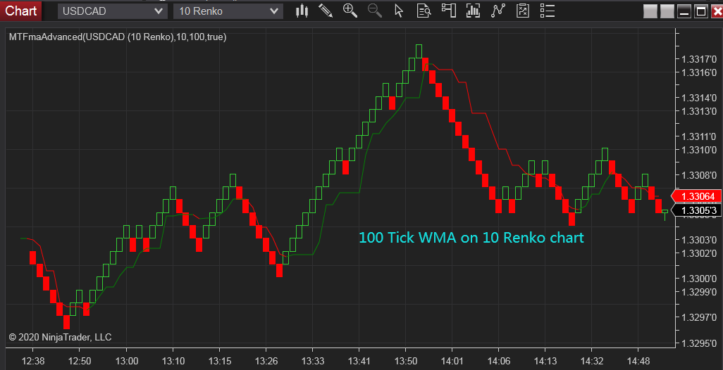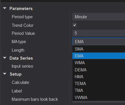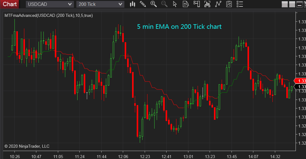 You can use any combination of Moving average type and period type, for instance, you can use a 5-min EMA on a 200 Tick chart as shown in the chart below: